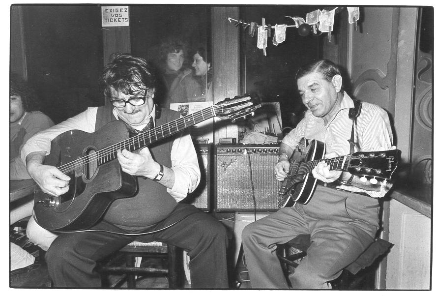 Maurice Gros Chien Ferre was born in Rouen, France around 1930. Little is known of his life. He and his partner Joseph Babagne Pouville began playing at the Clarion de Chasseur around 1960, and they played at this Montmartre café for 37 more years. Maurice Ferre has a totally unique style of playing. Though he usually used a Favino guitar, his approach was more like an electric player. He used the Stimer pickup and Fender twin-reverb amp to their best advantage. His repertoire numbered in the many hundreds of tunes. Much of the duo’s unusual sound came from Joseph’s unorthodox rhythm playing – rather than the traditional pompe, his chords had a rolling feel and he used a Gibson ES-125 instead of the usual Selmer type guitar. His harmonies were often as unusual as his rhythms. They made two LPs, and sadly neither is in re-release yet. The first of these "Le Train Gitane" is an outrageous collection of originals and popular tunes, all marked with great exuberance and droll humor. The second is a collection of tunes associated with Django. Hopefully these will soon be available for the world to hear again. Joseph Pouville passed away a few years ago, but Maurice is still living in Paris. After a few years off, he is out playing occasionally with Max Robin. It seems he is finally receiving the credit he deserves for his contributions to the Paris guitar legacy.